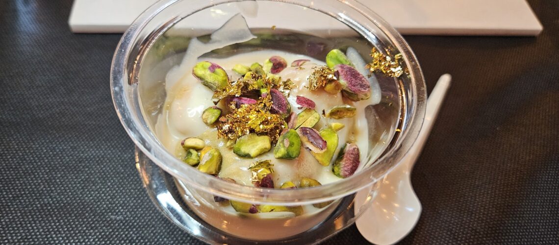 – Profiteroles oro del Guadiato, con ganache de chocolate blanco y relleno de mousse de pistacho, con pistacho tostado y oro de 24 quilates por encima.